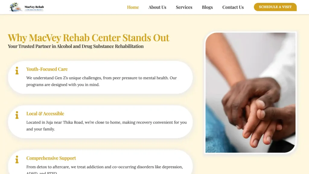 MacVey Rehab Center provides comprehensive addiction recovery and mental health treatment in Juja, Kenya. Offering inpatient and outpatient programs, detoxification, counseling, and aftercare services, MacVey specializes in personalized recovery journeys for individuals struggling with alcohol and drug addiction across all age groups.