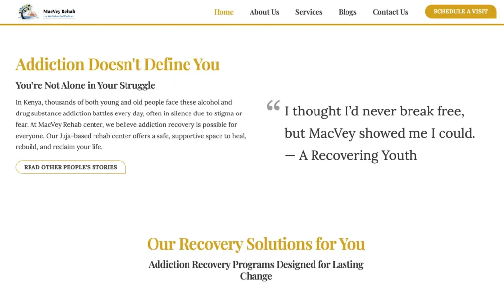 Limited online presence meant families couldn’t find professional addiction treatment when searching for “rehab center Nairobi” or “drug addiction treatment Kenya.” Stigma around addiction made traditional marketing approaches ineffective.